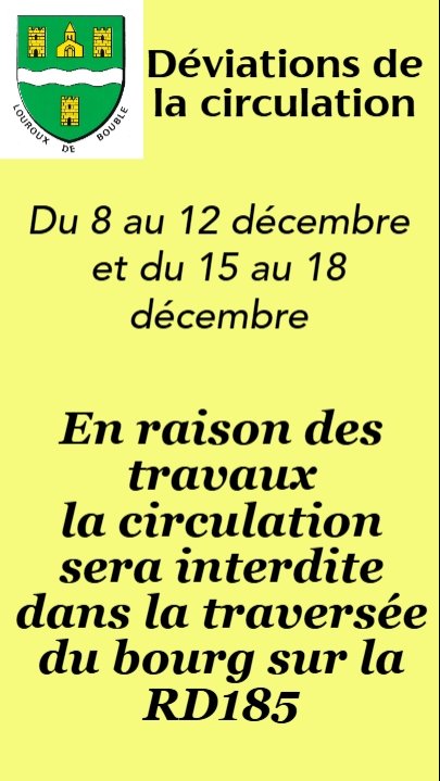 Du 8 au 12 décembre, et du 15 au 18 décembre, la circulation sera interdite dans la traversée du bourg en raison des travaux d'aménagement de la Place de l'église afin de permettre la réalisation des travaux d'assainissement et le goudronnage de la route.